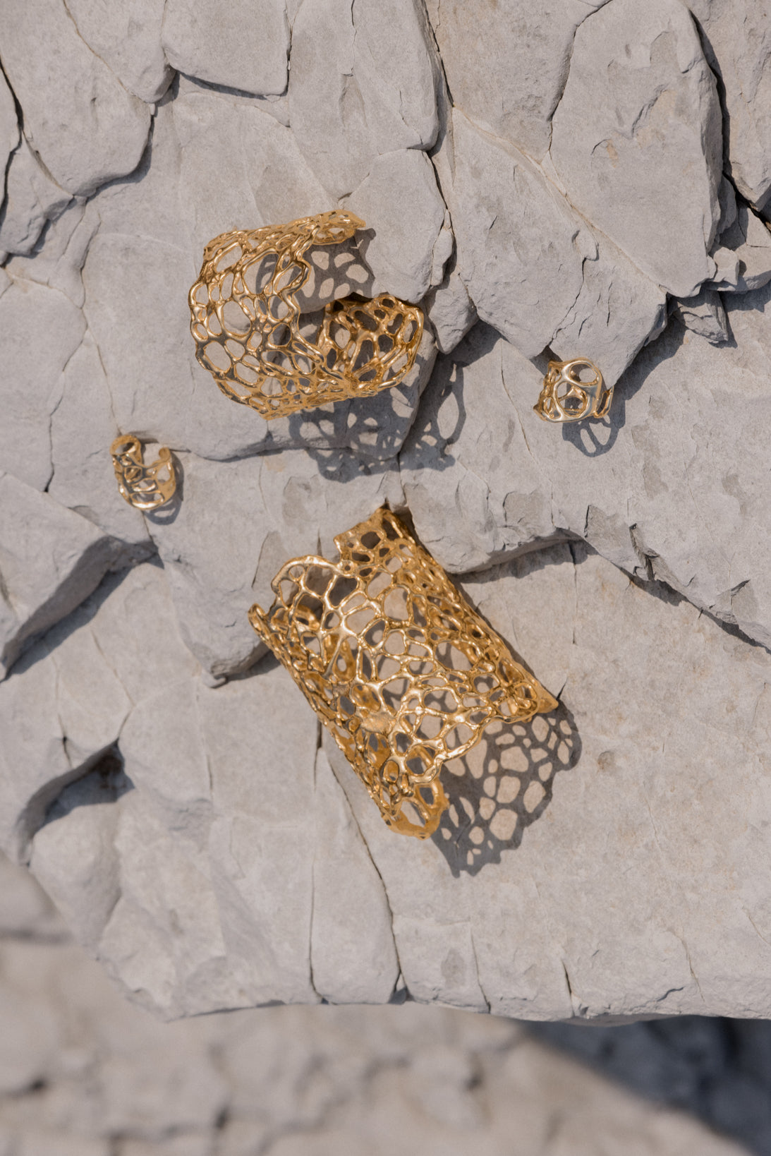 Son piezas ligeras, diferentes y llenas de textura, que nacen del azar y del control a partes iguales. Cada joya es irrepetible porque el proceso nunca se repite de la misma manera: ahí está su magia.