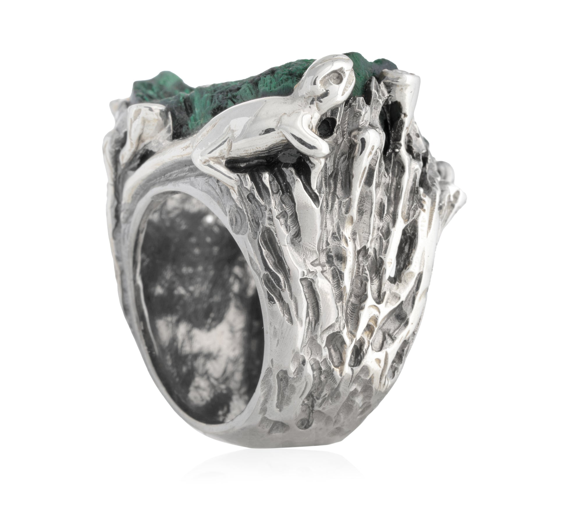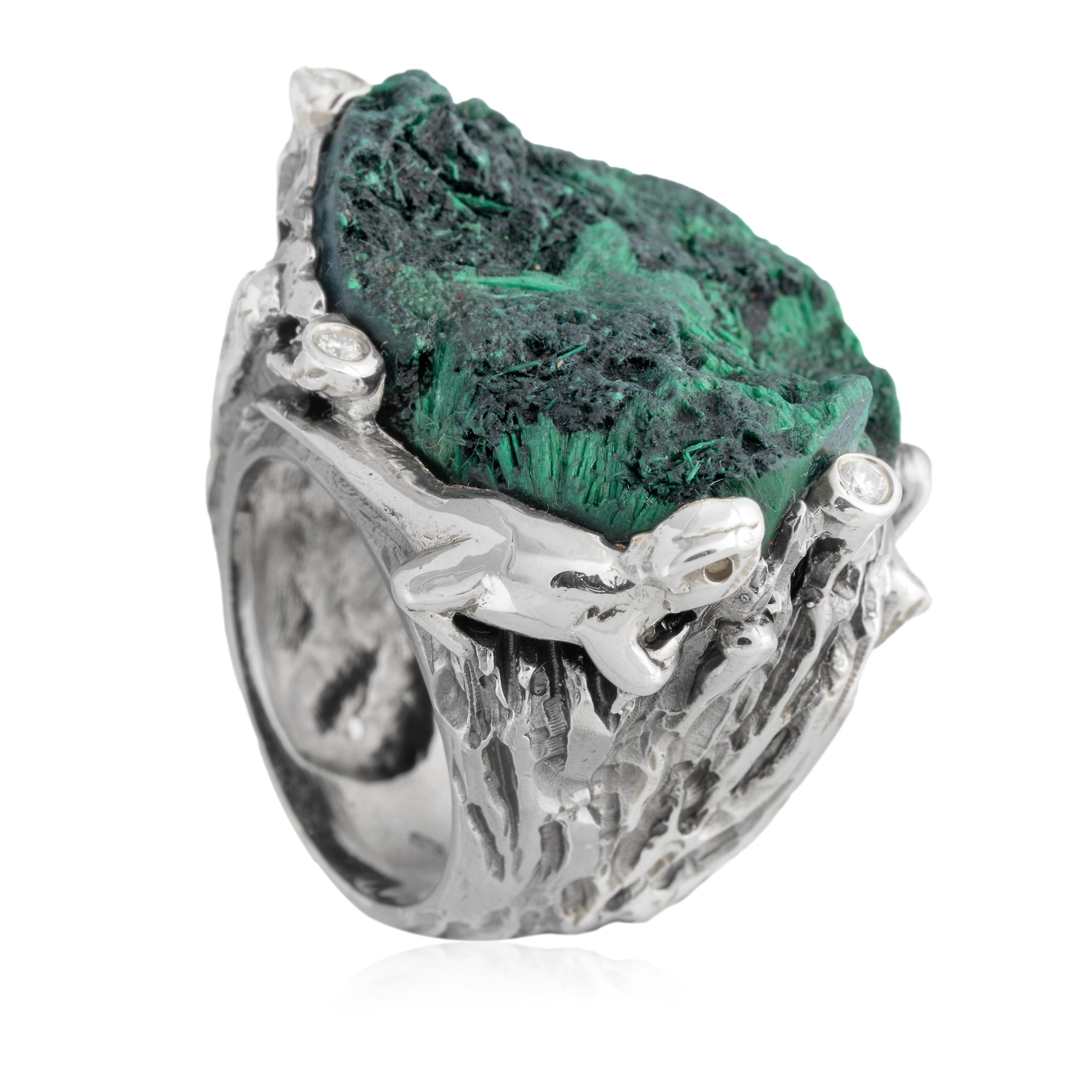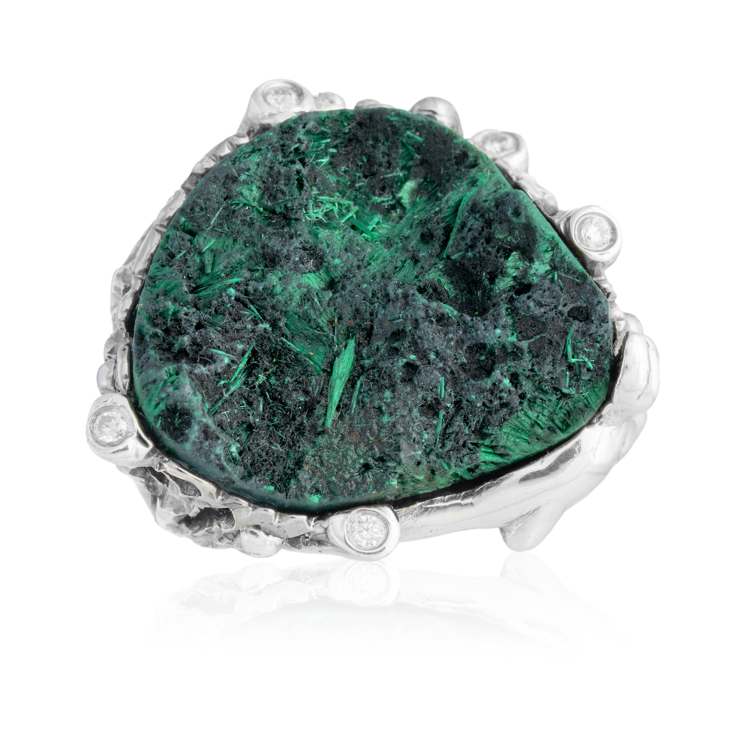 Anillo de plata de primera ley (925) con piedra malaquita ovalada en bruto engastada y 5 moissanitas. Presenta un acabado texturizado que recuerda a la naturaleza de un acantilado simulando la corteza de un árbol.