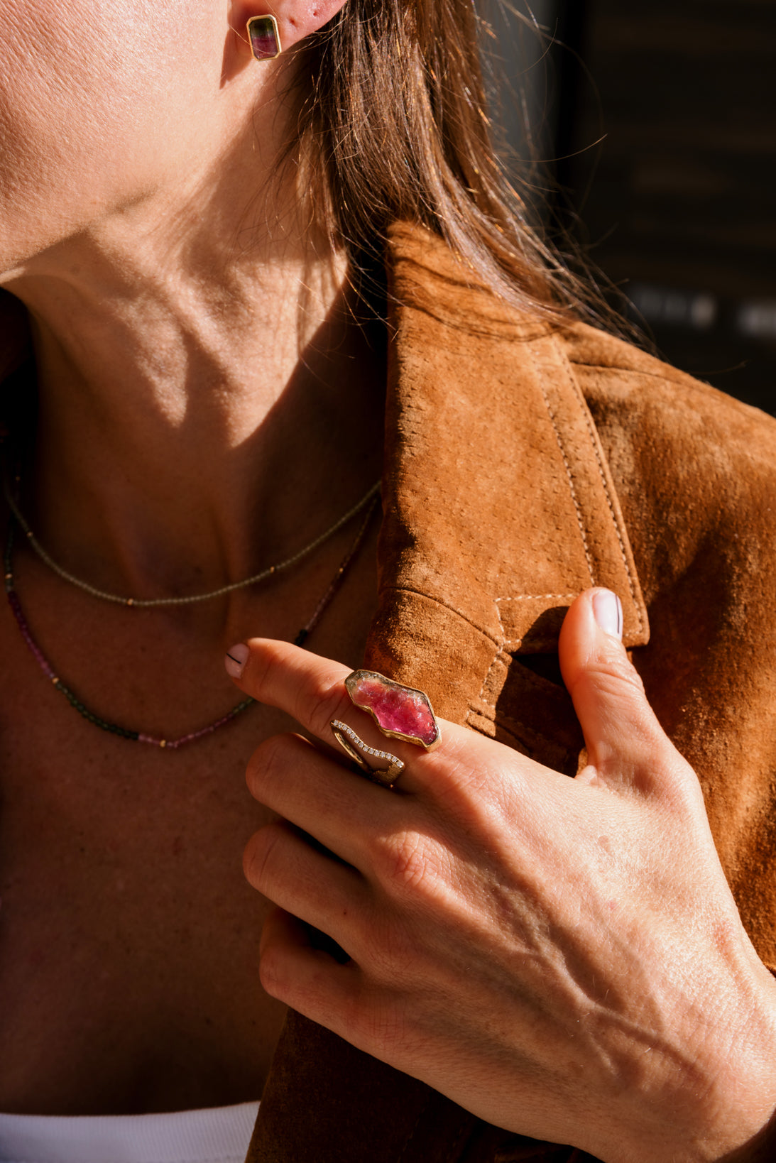 Anillo abierto de oro 18kt con piedra Turmalina Sandía en bruto irregular engastada y 14 diamantes talla brillante. Presenta un acabado rallado.