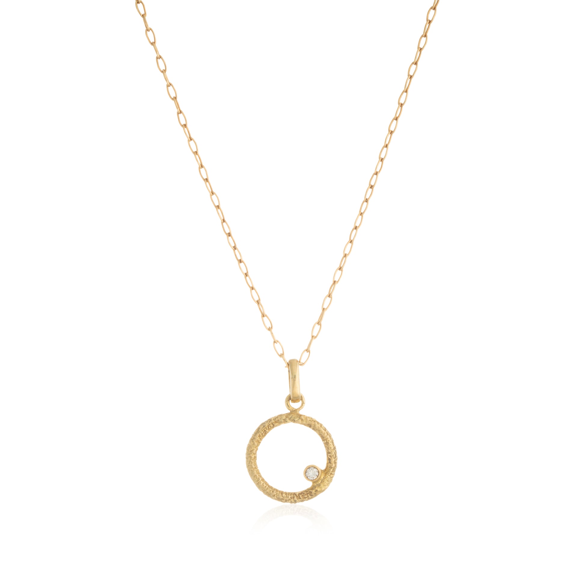 Colgante circular sin cadena de oro amarillo de 18k con un brillante al costado. Dando protagonismo a las formas y texturas de la naturaleza.