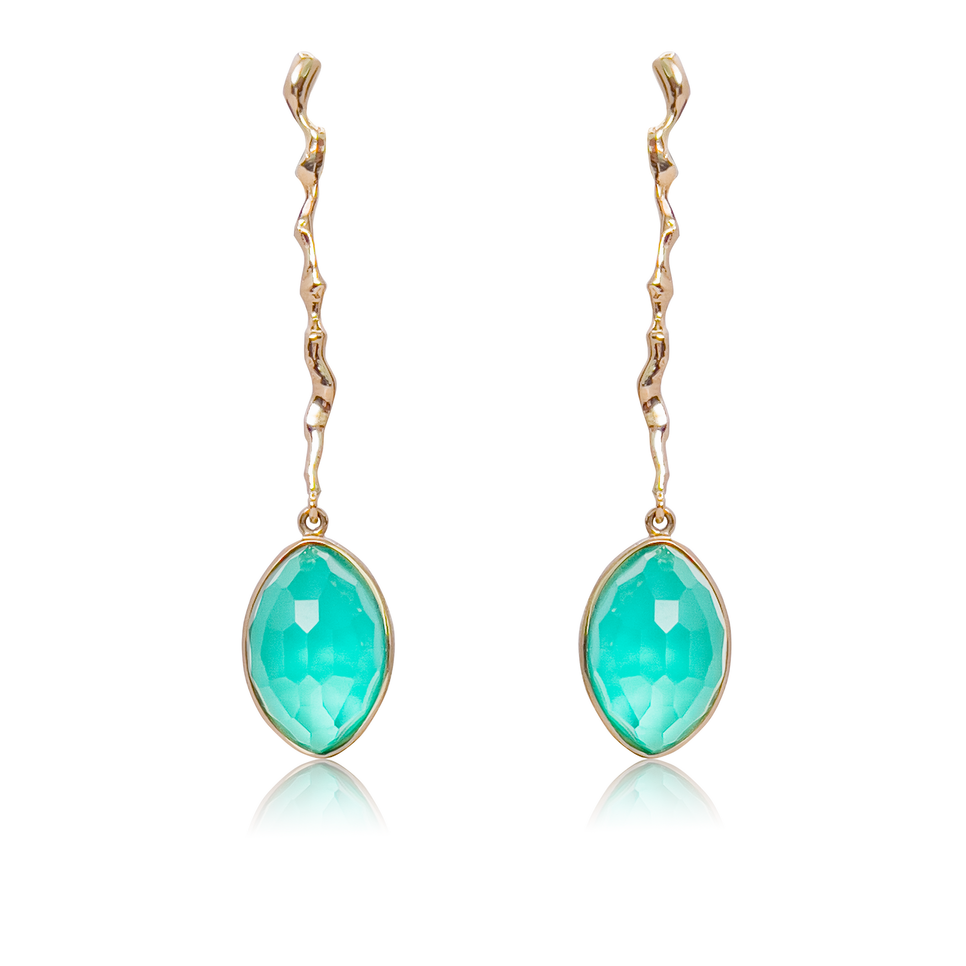 Pendiente de oro de 18kt en forma de ramita y piedra triplete en forma de navet con cuarzo.