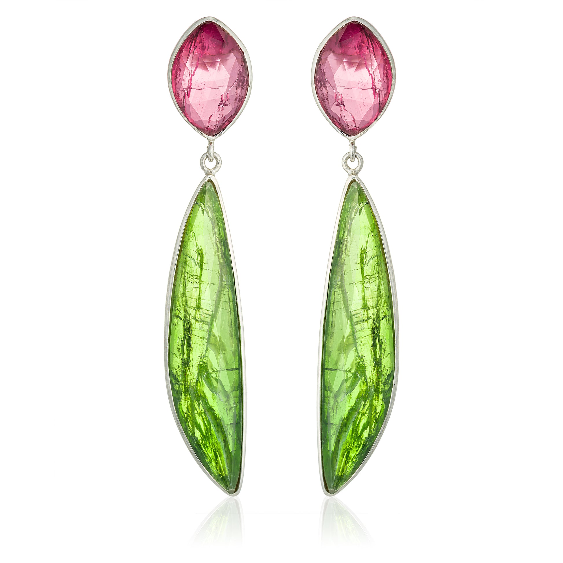 Pendientes de plata de ley (925) con piedras Turmalinas Rosas en redondo y Peridoto alargados. Biharri significa “dos piedras”, y es justo eso lo que hace especial a esta colección.