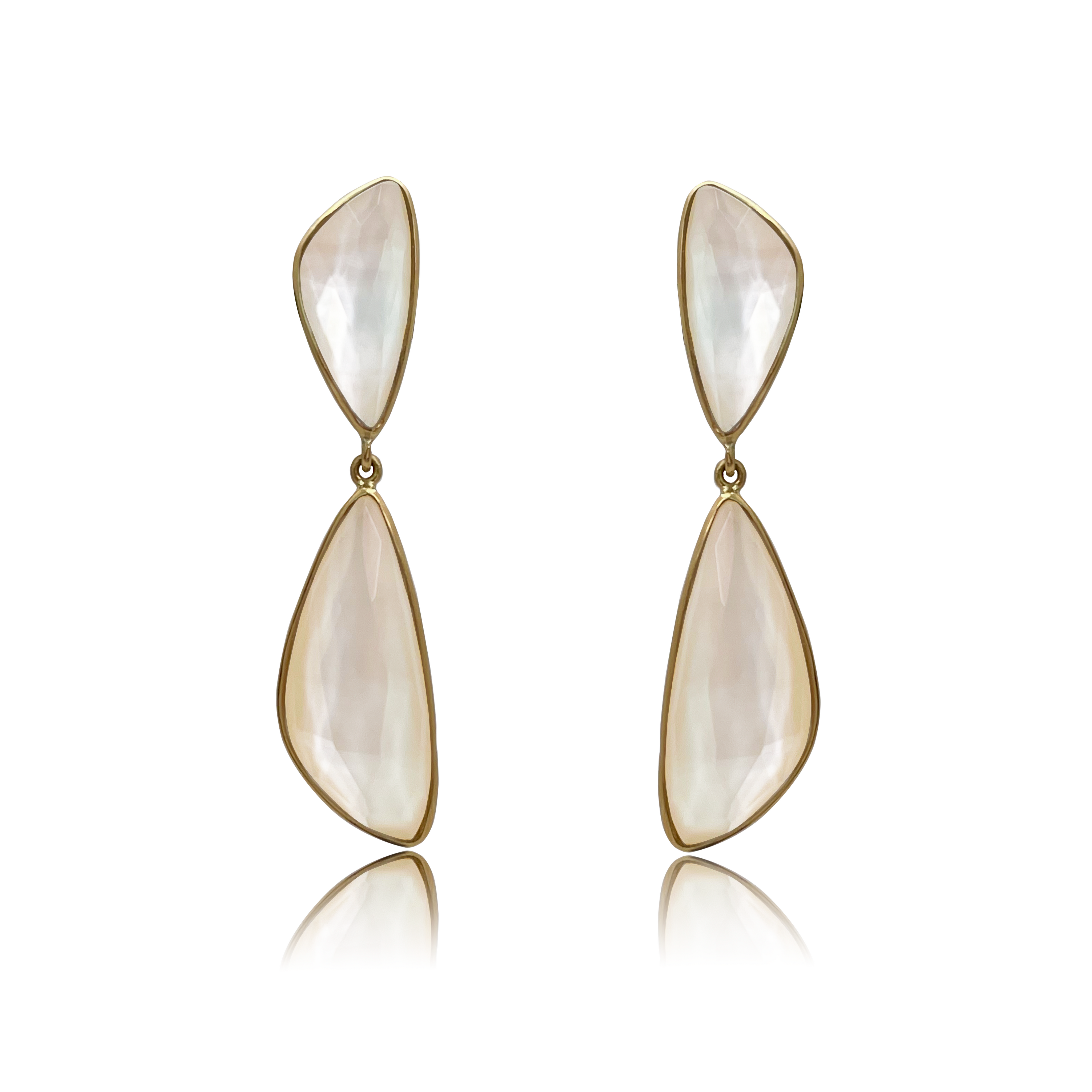 Pendiente de oro amarillo de 18kt y dos piedras nácar con cuarzo en forma mini trillón.