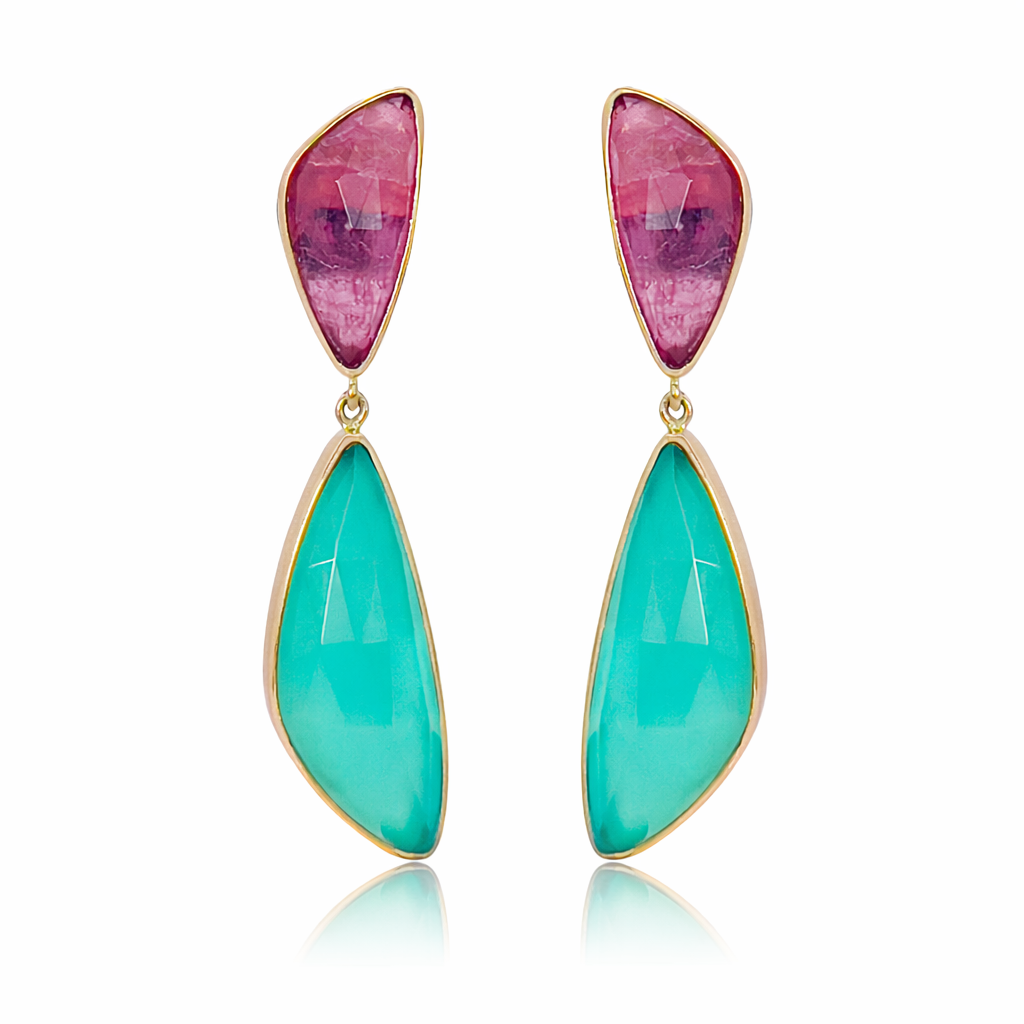 Pendiente de oro amarillo de 18kt y dos piedras turmalina rosa y apatite con cuarzo en forma mini trillón.