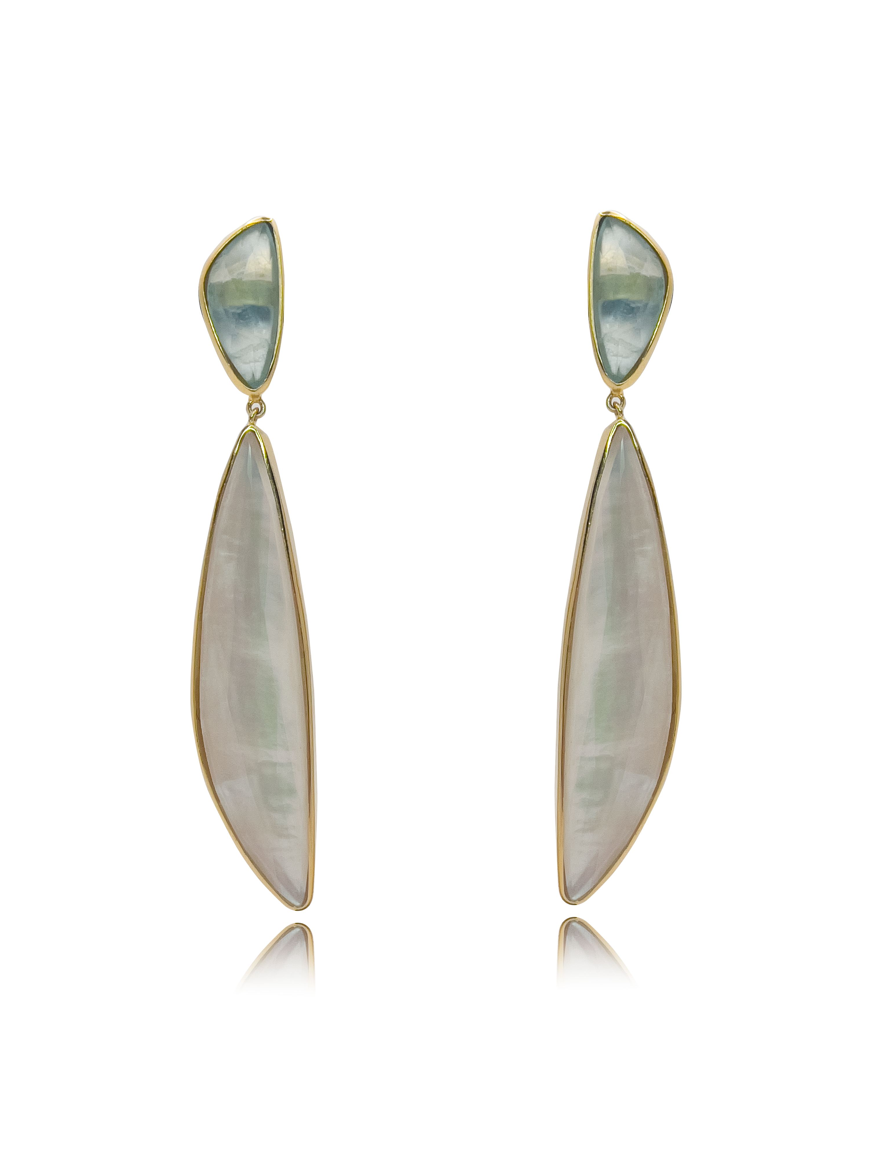 Pendiente de plata de ley 925 con baño de oro amarillo de 18kt y dos piedras aguamarina y nácar con cuarzo en forma trillón.